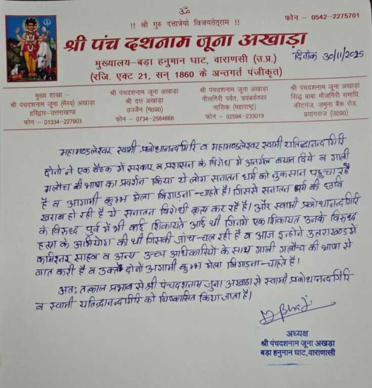 इसी बीच संतों के एक धड़े ने अखिल भारतीय अखाड़ा परिषद की तर्ज पर अखिल भारतीय आश्रम परिषद का गठन कर फिर नए विवाद को हवा दे दी थी। जूना अखाड़े से जुड़े महामंडलेश्वर स्वामी यतींद्रानंद गिरी और प्रबोधाननंद गिरि के परिषद का गठन करने से खिन्न जूना अखाड़े के अंतर्राष्ट्रीय अध्यक्ष ने उन्हें अखाड़े से निष्कासित कर दिया था।