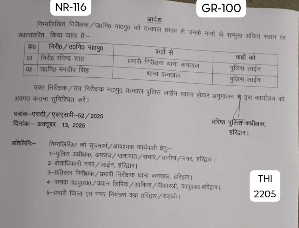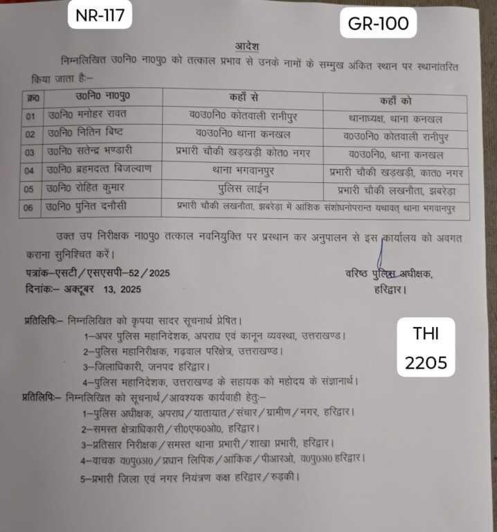 जबकि वरिष्ठ उप निरीक्षक नितिन चौहान को रानीपुर कोतवाली वरिष्ठ उपनिरीक्षक बनाकर भेजा गया है। खड़खड़ी चौकी प्रभारी सत्येंद्र भंडारी को कनखल एसएसआई बनाया गया है।