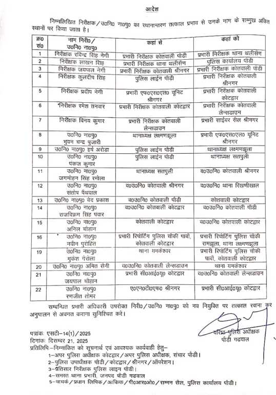 बता दें कि पौड़ी जिले के पुलिस कप्तान सर्वेश कुमार ने कुछ घंटे पूर्व जिले में इंस्पेक्टर, एसओ और चौकी इंचार्ज की तबादला सूची जारी की थी। जंबो सूची को लेकर पूरे जिले में हड़कंप मच गया था।