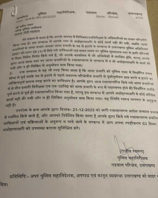 आईजी ने पौड़ी पुलिस कप्तान को पत्र लिखकर तबादला सूची की अनुमति न लेने समेत कई गंभीर बातें लिखी है।उन्होंने तीन दिन के अंदर पौड़ी पुलिस कप्तान को तबादला सूची को लेकर स्पष्टीकरण देने के निर्देश दिए हैं।